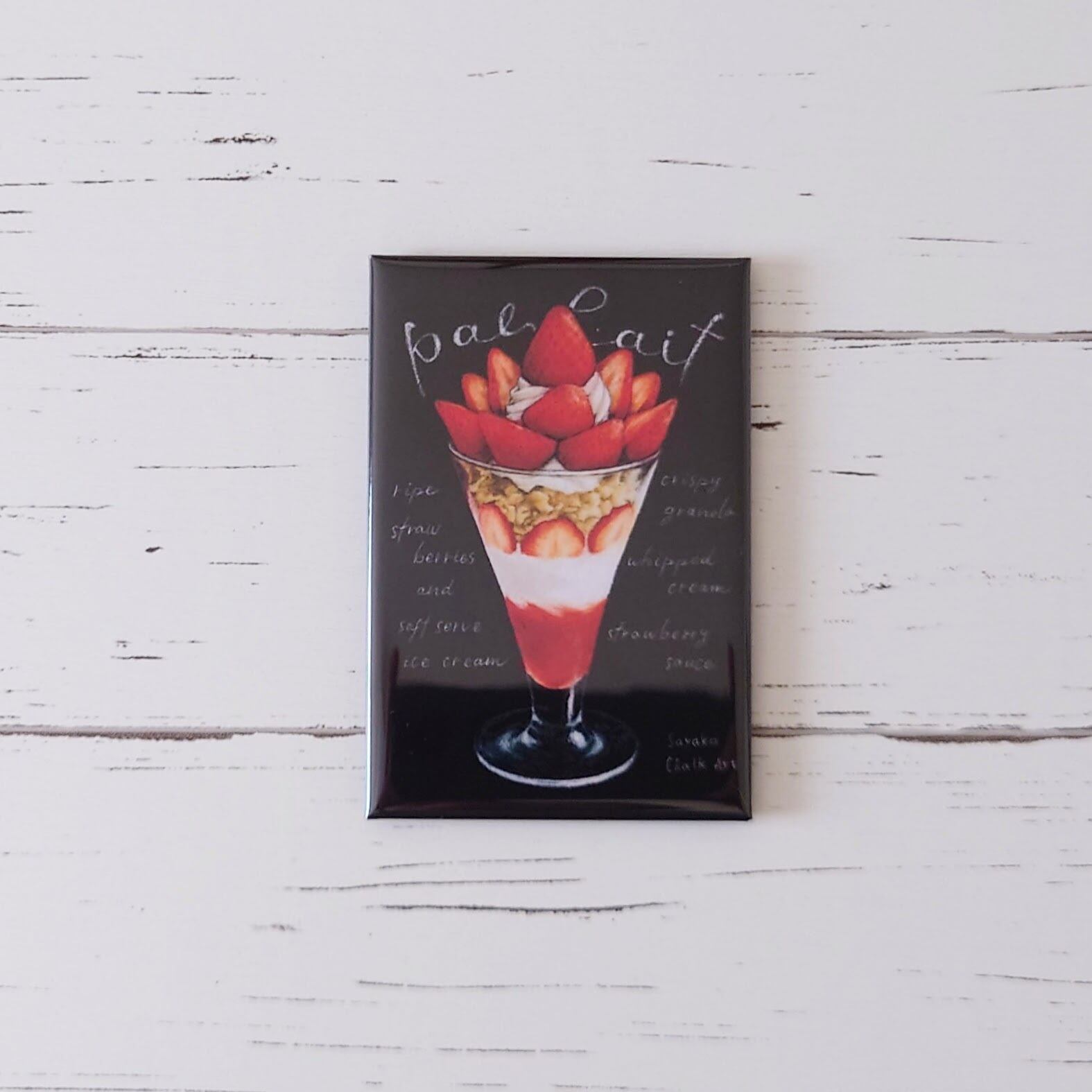 チョークアートで描いたいちごパフェのイラストが缶マグネットになりました。